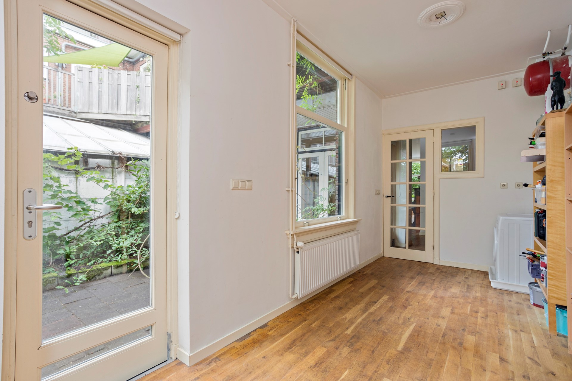 Aansluitend bevindt zich een praktische tussenruimte, eveneens met een deur naar de tuin. Hierachter ligt nog een lichte (slaap-/werk-/hobby)kamer, die ook toegang biedt tot de tuin. In deze ruimte is momenteel de opstelplaats voor de wasmachine gesitueerd.
