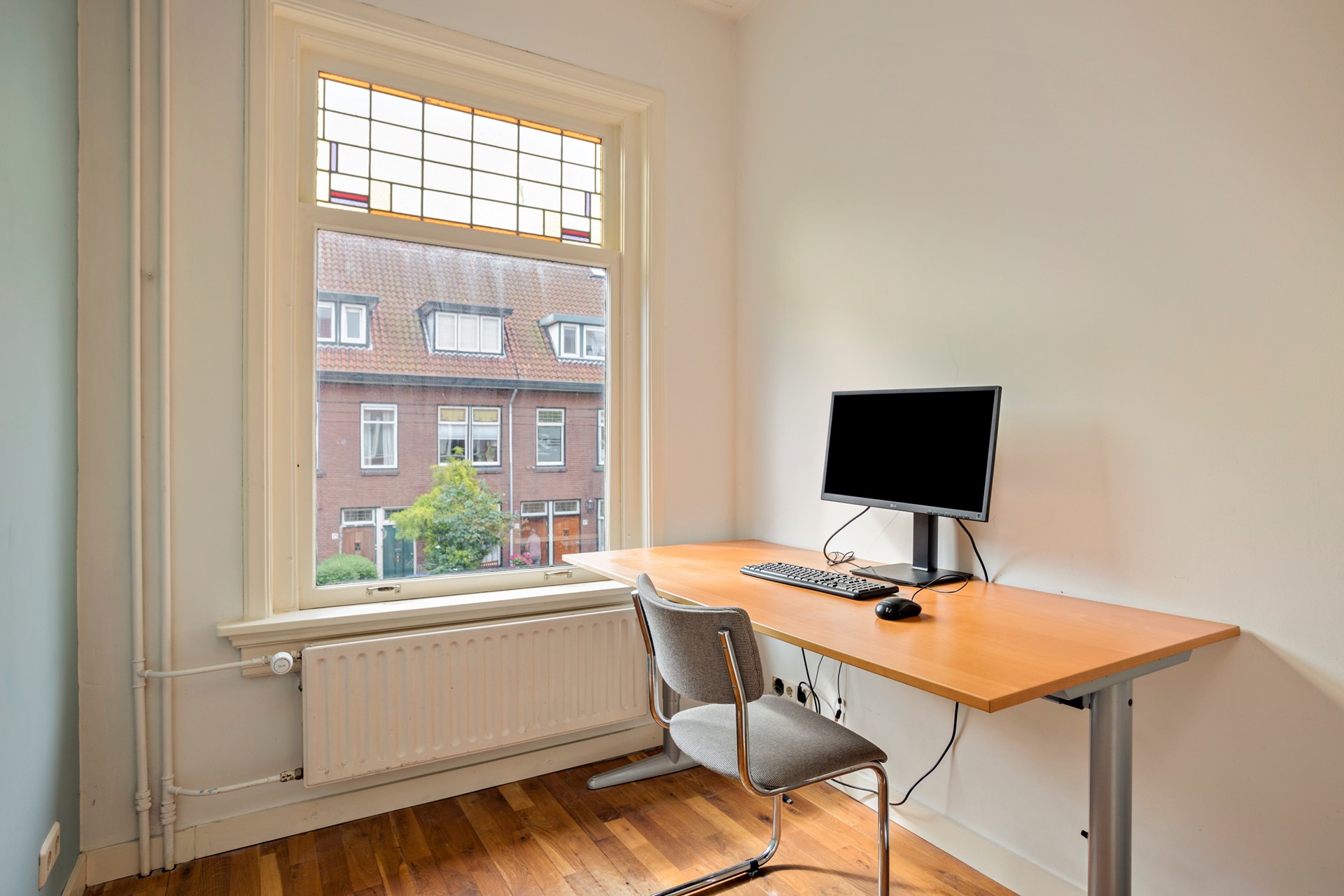 Aan de voorzijde bevindt zich een charmante studeer- of kinderkamer, gekenmerkt door fraaie glas-in-loodramen. De woonkamer is sfeervol en licht, met een houten parketvloer, een moderne houtkachel en openslaande deuren naar het royale dakterras. Aan de voorzijde zorgt de erker met glas-in-loodramen voor extra karakter en lichtinval.