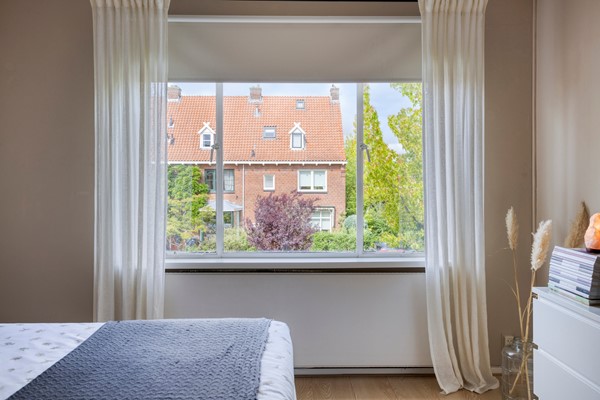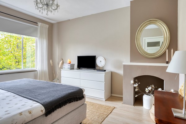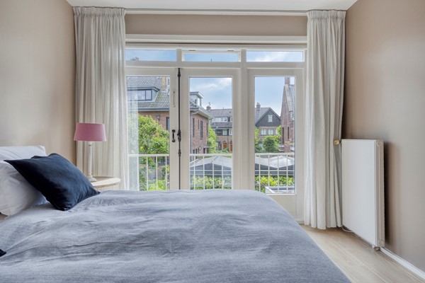 Overloop. Op deze verdieping zijn drie goed formaat slaapkamers. Twee slaapkamers beschikken over een inbouwkast en één slaapkamer aan de achterzijde heeft ook nog openslaande deuren naar het balkon. Verder is er op deze verdieping een badkamer met douche, ligbad, toilet en wastafel met meubel. Grappig detail is de aparte deur naar de kamer aan de voorzijde.