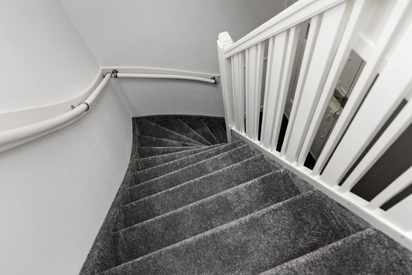 Intercom, apartment entrance, hall, renovated meter cupboard, carpeted stairs to second floor.