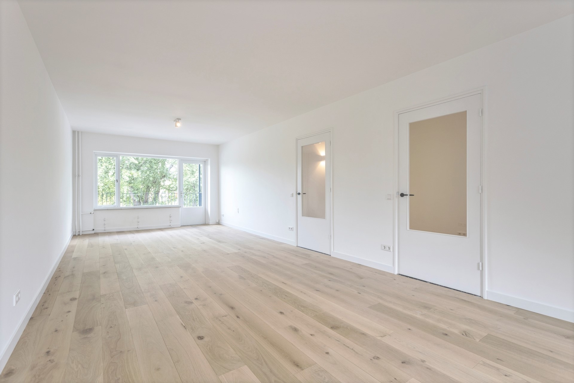 Vernieuwde en uitgebreide meterkast aan buitenzijde; entree; tochtportaal; ruime hal met toegang tot alle vertrekken, lichte en zonnige woon-eetkamer (ca. 9.56 x 3.78 m) met toegang tot een balkon (op het noorden) voorzien van elektra met fraai uitzicht op het "Irispark" en de "Oudenhofmolen" (mogelijkheid om hier 2 kamers van te maken er zijn al 2 toegangsdeuren en voldoende elektra); nieuwe keuken (ca. 2.84 x 2.10 m.) voorzien van houten werkblad en alle denkbare inbouwapparatuur o.a. inductiekookplaat, afzuigkap, vaatwasser en koel-vriescombinatie; bijkeuken/provisie-berging met nieuwe boiler; nieuwe tot aan plafond betegelde badkamer (2.68 x 1.51 m.) met inloopdouche met glazen wand, wastafel(meubel), spiegel en keramische vloertegel in marmerlook; separaat vrij hangend toilet met fontein en keramische vloertegel met marmerlook; inpandige berging met opstelplaats voor zowel wasmachine en wasdroger en voorzien van nieuwe mechanische ventilatie box; 2 slaapkamers (ca. 4.12 x 2.68 en 4.12 x 2.00 m.) aan de achterzijde. Alle wanden en plafonds zijn opnieuw gestuct; nieuw HR++ dubbel glas in alle raampartijen; doorgelegd lamelparket behalve in badkamer, keuken en toilet (deze zijn voorzien van een keramische vloertegel met marmerlook) en moderne in- en opbouwspots.