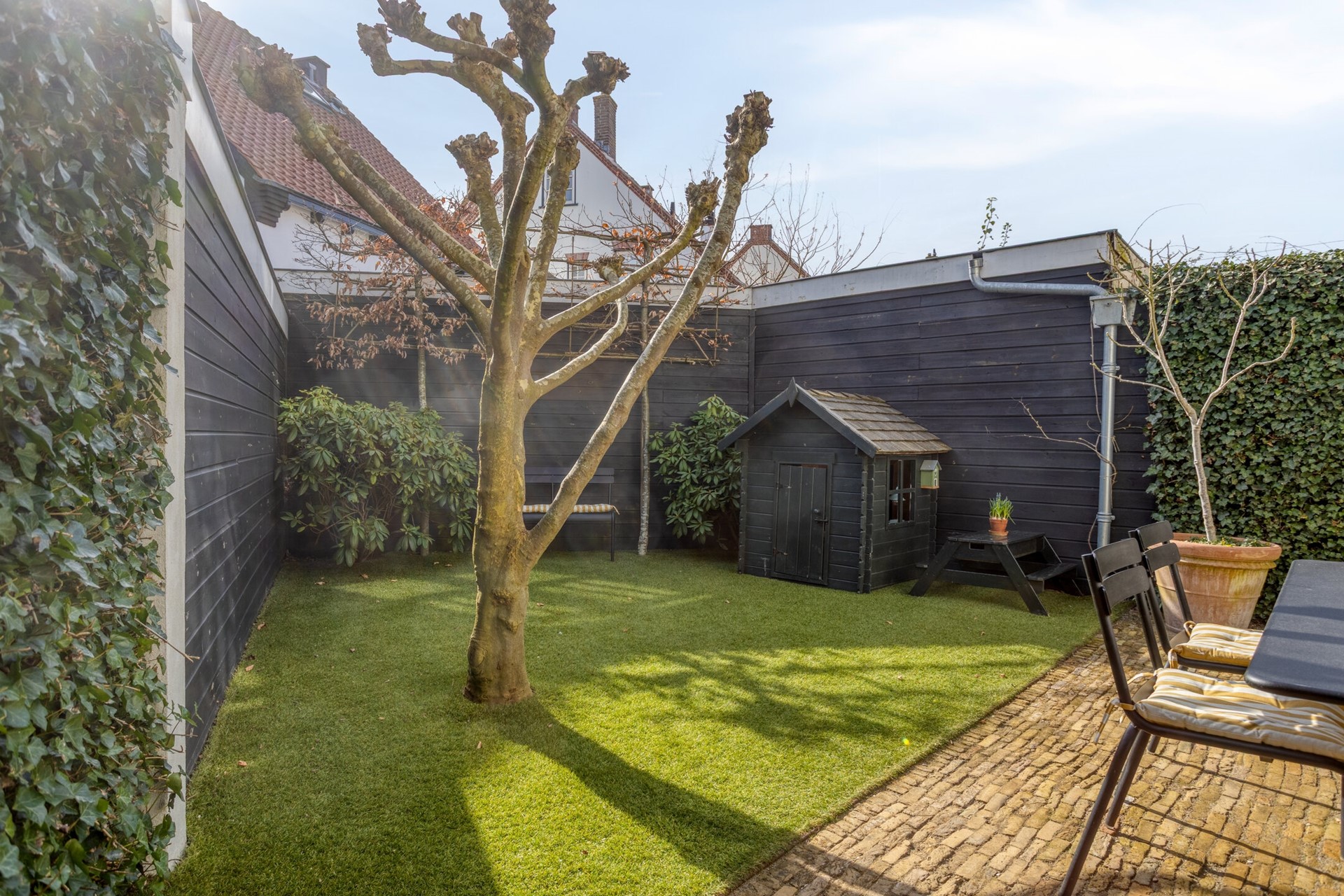 - Zeer verzorgde, beschutte, groene en zonnige voor-, zij- en achtertuin (zuiden) met 3 houten (buiten)bergingen en handige zij-achterom